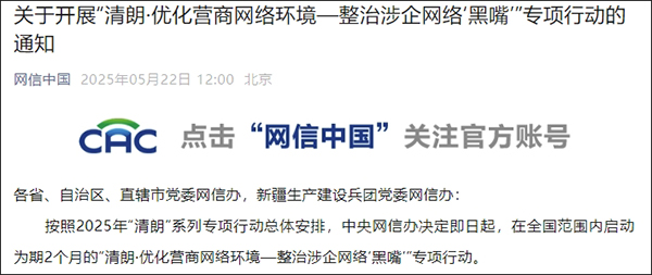 中央網信辦微信公眾號“網信中國”5月22日發佈關於開展“清朗·優化營商網絡環境—整治涉企網絡‘黑嘴’”專項行動的通知。