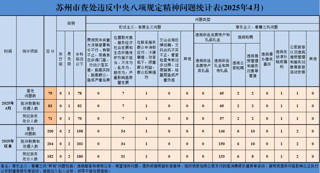 圖中數據顯示,2025年4月,蘇州市已查處違反中央八項規定精神問題79件,批評教育和處理人數83人,黨紀政務處分人數71人。