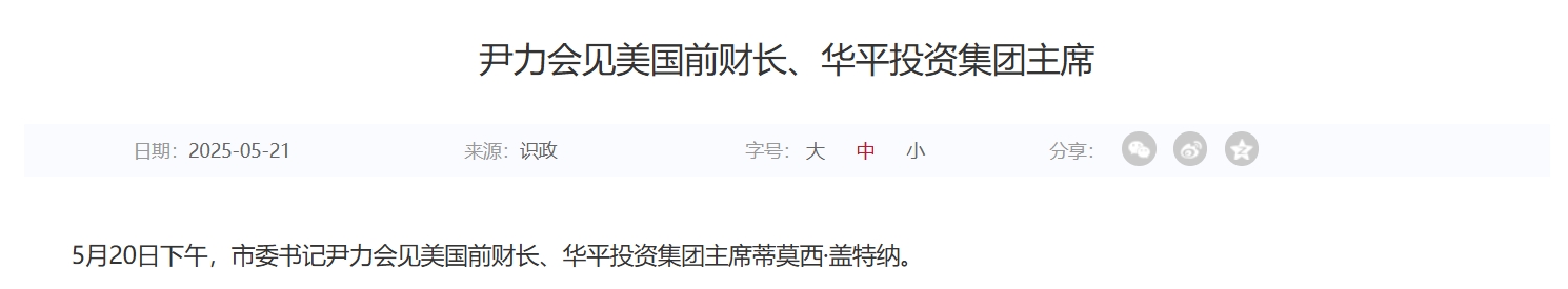 “國家金融監管總局”微信公眾號21日也發佈了消息,國家金融監督管理總局黨委書記、局長李雲澤在21日當天會見了蓋特納一行,雙方就國際經濟金融形勢、中國經濟金融發展前景和金融業對外開放等議題進行交流。去年12月,李雲澤也曾會見來訪的蓋特納一行。當時雙方也就宏觀經濟金融形勢、中國金融業發展前景、華平在華投資發展等議題進行了交流。