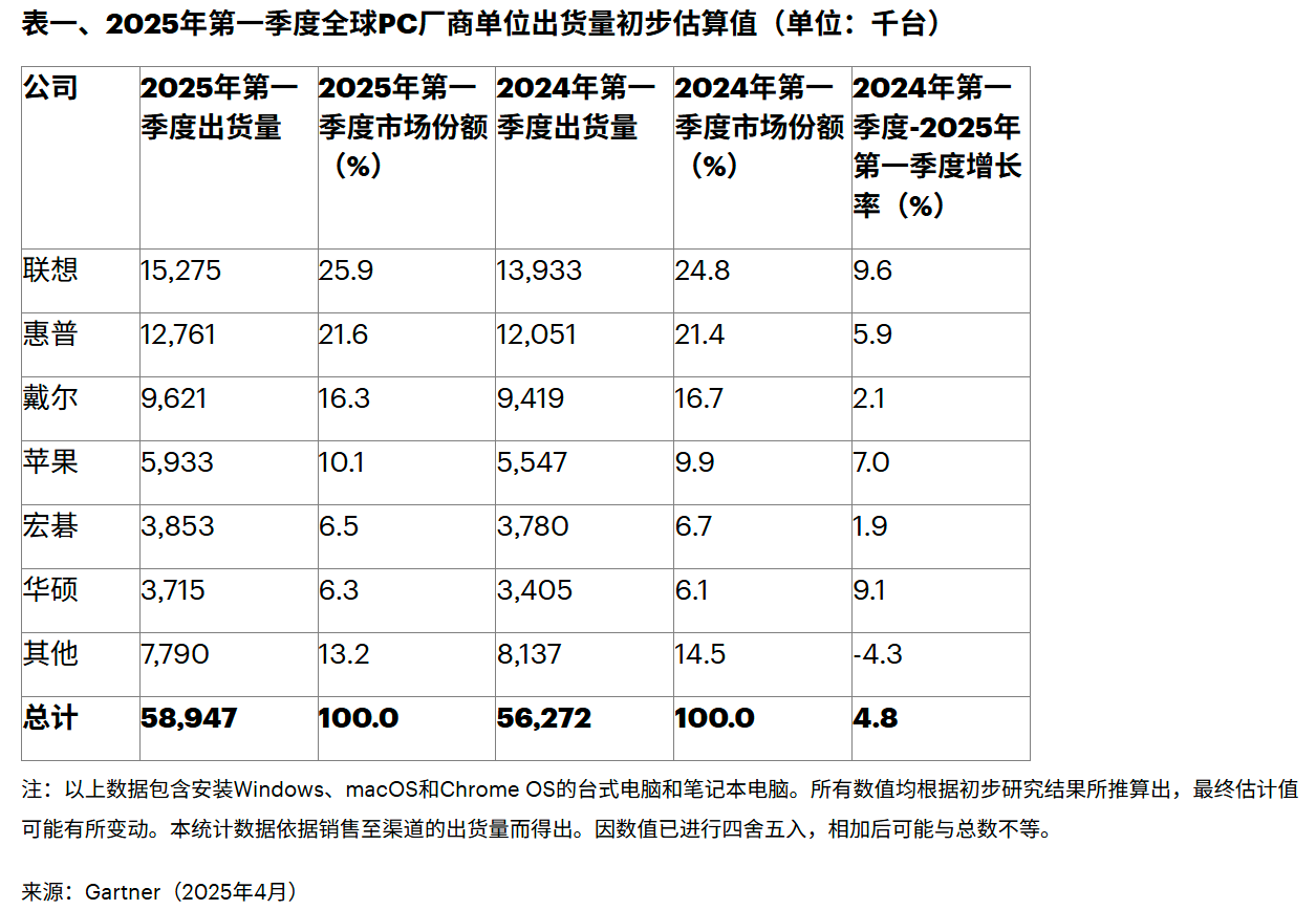 觀察者網查詢市場調研機構Gartner數據,在2025年第一季度全球PC廠商單位出貨量初步估算中,聯想出貨量達1527.5萬台,同比增長9.6%,以25.9%的市場份額位居第一。