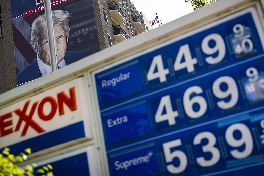 當地時間2025年5月16日,美國華盛頓,一家埃克森石油站在赫裏提奇基金會懸掛的特朗普總統橫幅旁宣傳油價 視覺中國