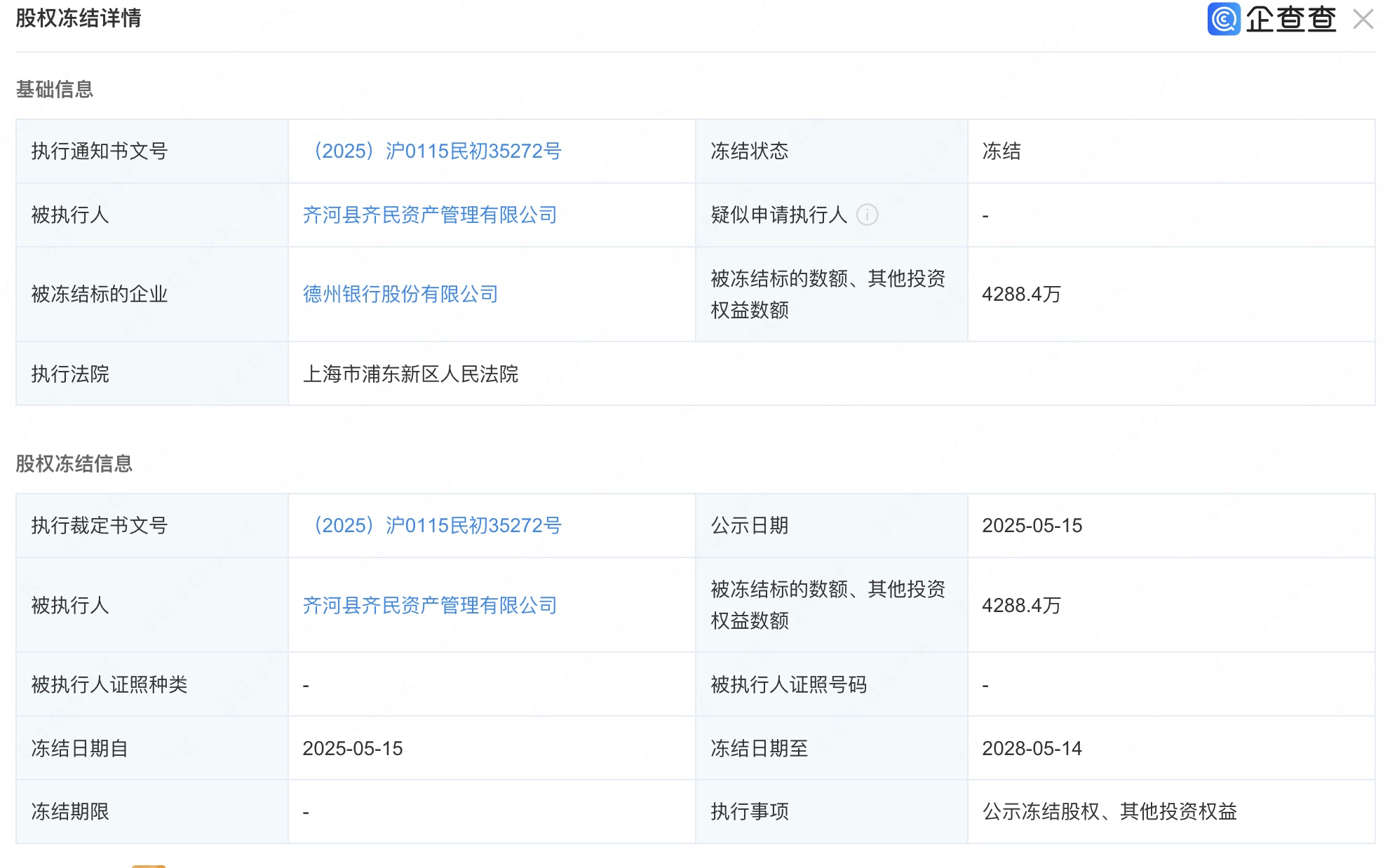 在該案件中,齊河縣齊民資產管理有限公司作為被執行人,其持有的德州銀行股份有限公司4288.4萬元股權被依法凍結。凍結期限自2025年5月15日起,至2028年5月14日止,相關執行裁定書文號為(2025)滬0115民初35272號。值得一提的是,除德州銀行這筆股權外,齊河縣齊民資產管理有限公司所持有的1000萬元齊河農商銀行股權也因該案件遭到司法凍結。