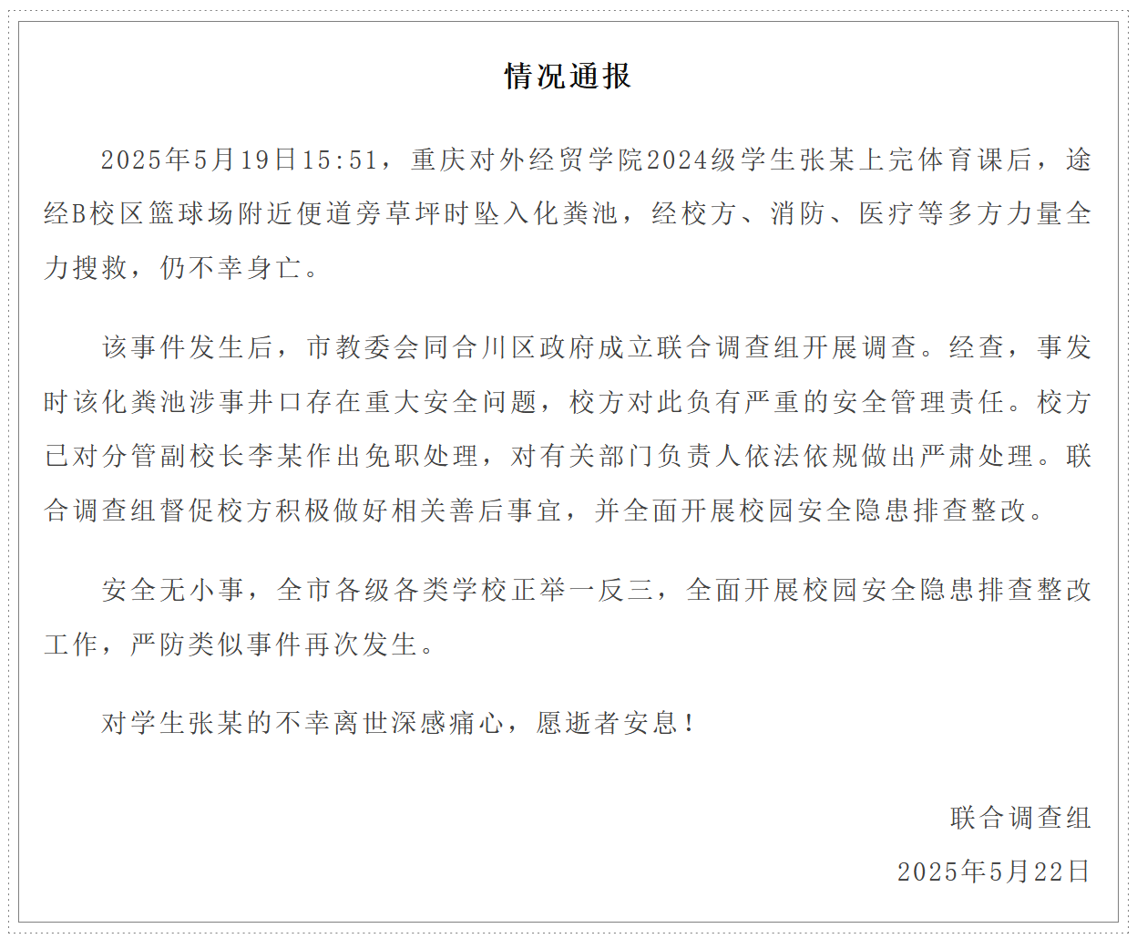 5月20日,重慶對外經貿學院發佈情況通報稱,2025年5月19日下午,該校發生一起學生墜池事故,造成1人死亡,學校對此深感悲痛和惋惜。當天下午3時51分,該同學在體育課後不慎墜入化糞池,同行同學施救未果後向老師報告。學校立即投入救援並報警求助。經消防、醫療等力量全力施救,仍不幸死亡。目前,該校已成立工作專班,配合有關部門處置,全力做好善後事宜,並加強風險排查,確保校園安全。
