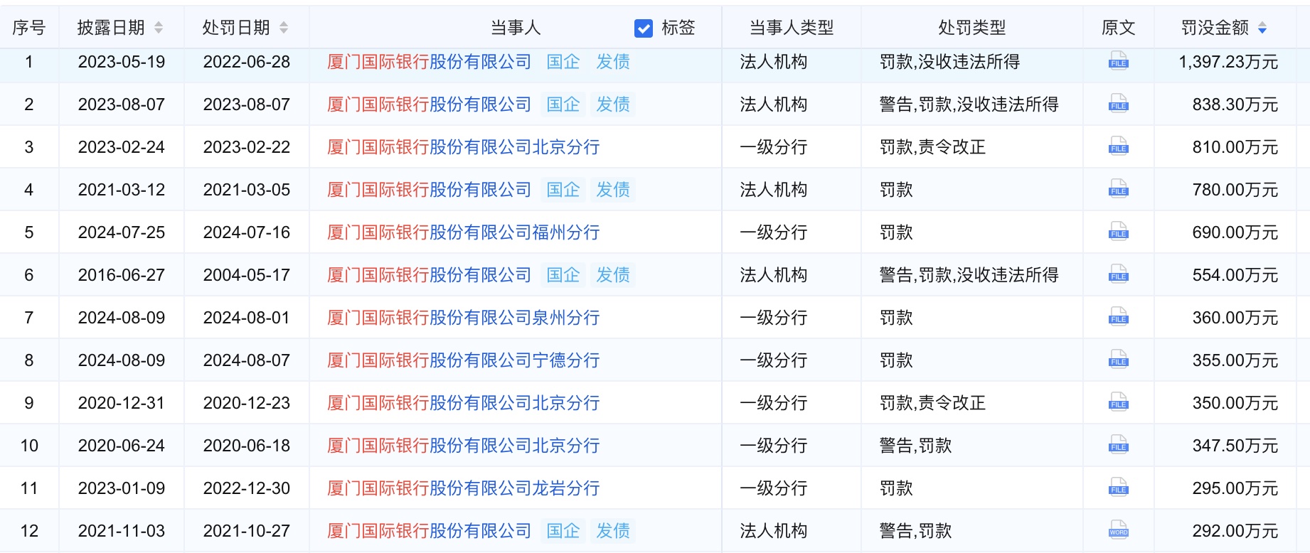 2023年5月,廈門銀保監局對廈門國際銀行開出“天價”罰單,針對其涉及信貸資金流向監控失效、貸款“三查”制度形同虛設、違規辦理房地產開發貸款等21項違規行為,合計罰沒1397.23萬元,並問責10餘名責任人。該罰單所涉業務均發生於2020年之前,暴露出該行長期存在的歷史遺留問題。2024年,監管風暴進一步升級:7月,福建監管局對廈門國際銀行福州分行處以690萬元罰款,直指其信貸業務內控機制形同虛設;8月,泉州、寧德兩地分行因違規辦理存單質押貸款、超需求授信等問題,分別被處以360萬元和355萬元罰款。僅2024年7月至8月間,該行在福建轄內即被罰沒1405萬元,信貸業務違規佔比超九成。