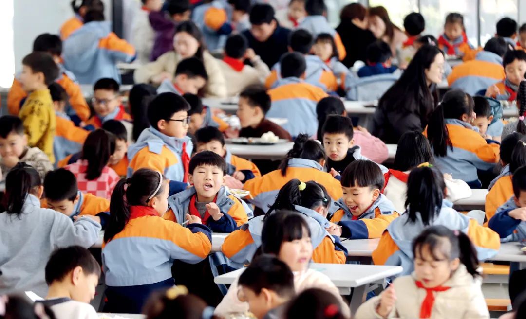 2025年2月18日,浙江湖州德清縣,春暉小學的學生們在食堂內享用營養午餐。 中新