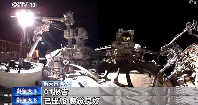 節點艙的出艙口是位於空間站背向地球的一側,開門後首先看到的是浩瀚的太空,出艙後航天員陳冬報告“感覺良好”。