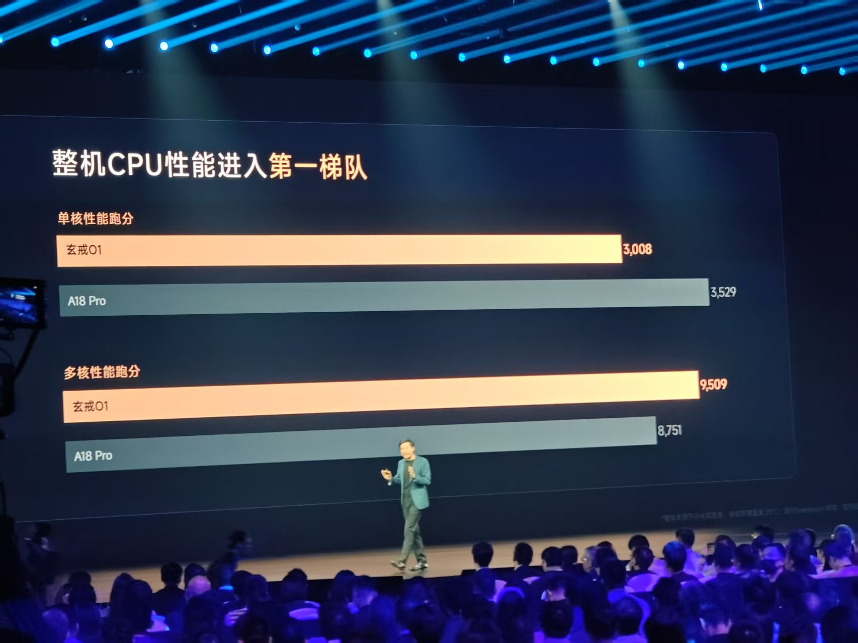 在跑分測試中,雷軍沒有對標自己主要的供應商高通和聯發科,而是對比蘋果最新芯片。現場顯示,玄戒O1搭載於小米15S Pro,CPU單核性能跑分3008,落後蘋果最新的3納米A18 Pro約500分,而多核跑分9509,比A18 Pro高了約800分。GPU設計中,相比聯發科12核的方案,玄戒O1激進地堆到了16核,曼哈頓3.1測試達到330幀,領先A18 Pro的230幀,ztec 1440p測試達到110幀,領先蘋果的70幀。