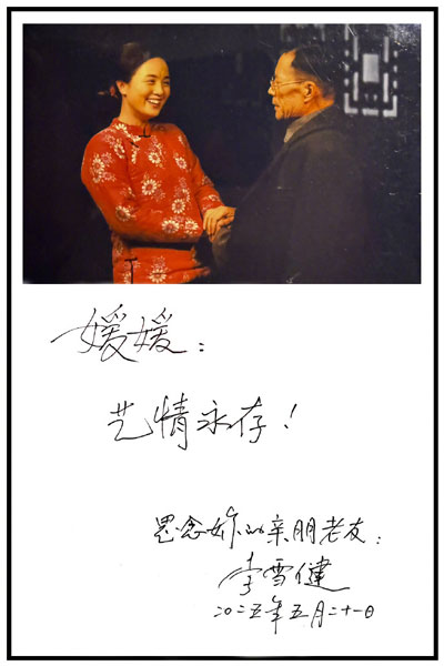 李雪健珍藏的與朱媛媛在電視劇《人活一句話》中的劇照 ,李老師手寫贈言悼念:“媛媛,藝情永存!”