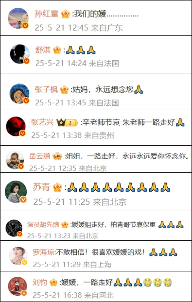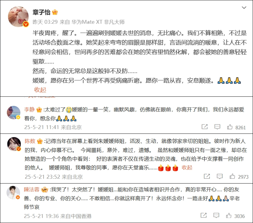 部分藝人悼念朱媛媛的發文