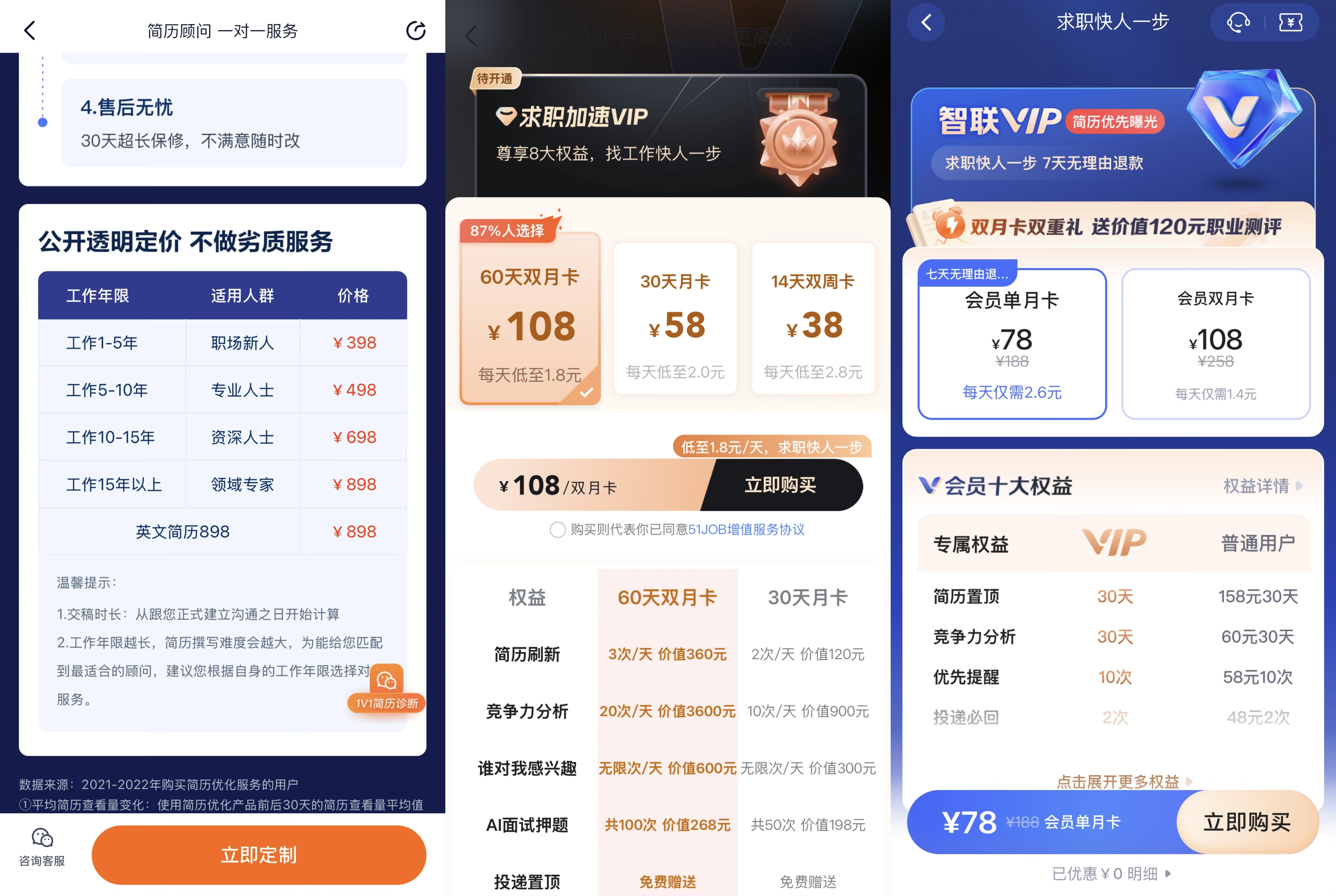 在前程無憂,平台會提醒求職者,開通VIP可“尊享8大權益,找工作快人一步”。VIP開通價格從38-108元不等,其中,38元只可使用14天。如若開通月卡、雙月卡,則能享受簡歷投遞置頂、與企業優先溝通的服務。