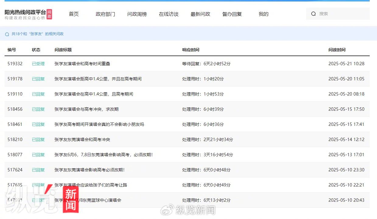 在東莞市有關部門主辦的“陽光熱線問政平台”,記者發現,已有十多名網友進行反映,希望張學友演唱會能夠改期。一名網友在反映帖子中稱,張學友演唱會於6月6日、7日、8日連續三天在東莞籃球中心舉行。這三天正是高考的日子,演唱會場館和高考考點東莞市第六高級中學距離只有2公里。即使政府承諾做好了萬全的措施和預案,作為高考的家長,我們仍有諸多顧慮,哪怕只有萬分之一的可能對高考產生影響。這名網友在帖子中質疑,高考時間早已固定,全年檔期充裕,演唱會為什麼一定要選擇在高考時間舉辦。