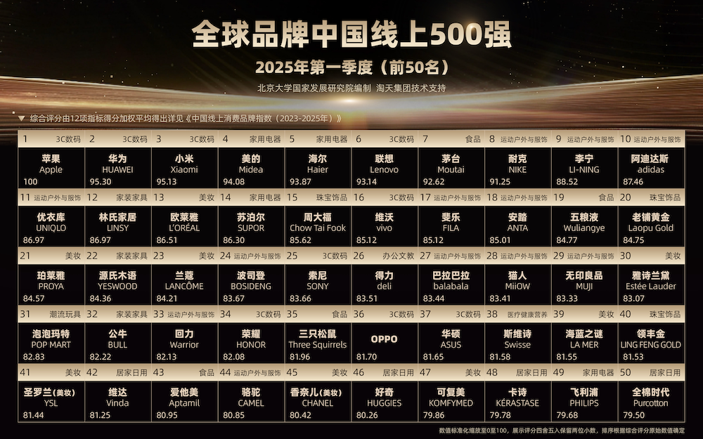 北大”中國線上消費品牌指數(CBI)“是全球首個以真實消費大數據為基礎、聚焦高質量發展的線上消費指數。研究團隊基於淘寶天貓平台消費大數據,通過建模分析,對全網所有品牌進行評分,首次以“一籃子”消費品牌的平均分來刻畫消費品質變化,並編制出全球首個完全基於消費者實際購買行為的品牌榜單“全球品牌中國線上500強”。指數與榜單將按季度,持續公佈。