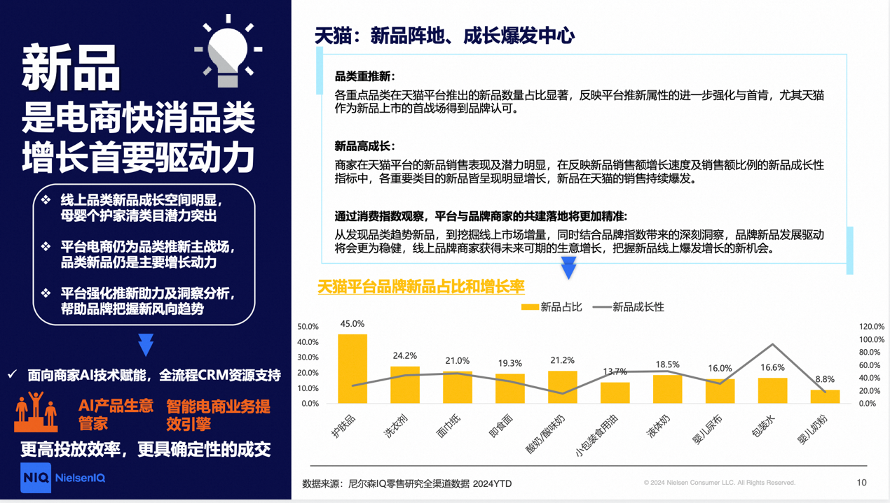 報告顯示,新品是電商快消品類增長的首要驅動力。天貓平台作為新品頭部陣地和成長爆發中心,其新品銷售表現及潛力尤為顯著。尼爾森IQ零售研究全渠道數據顯示,新品在電商快消品類中的佔比和增長率均表現突出。2024年,天貓平台的新品佔比和成長性指標均顯示出強勁的增長潛力。