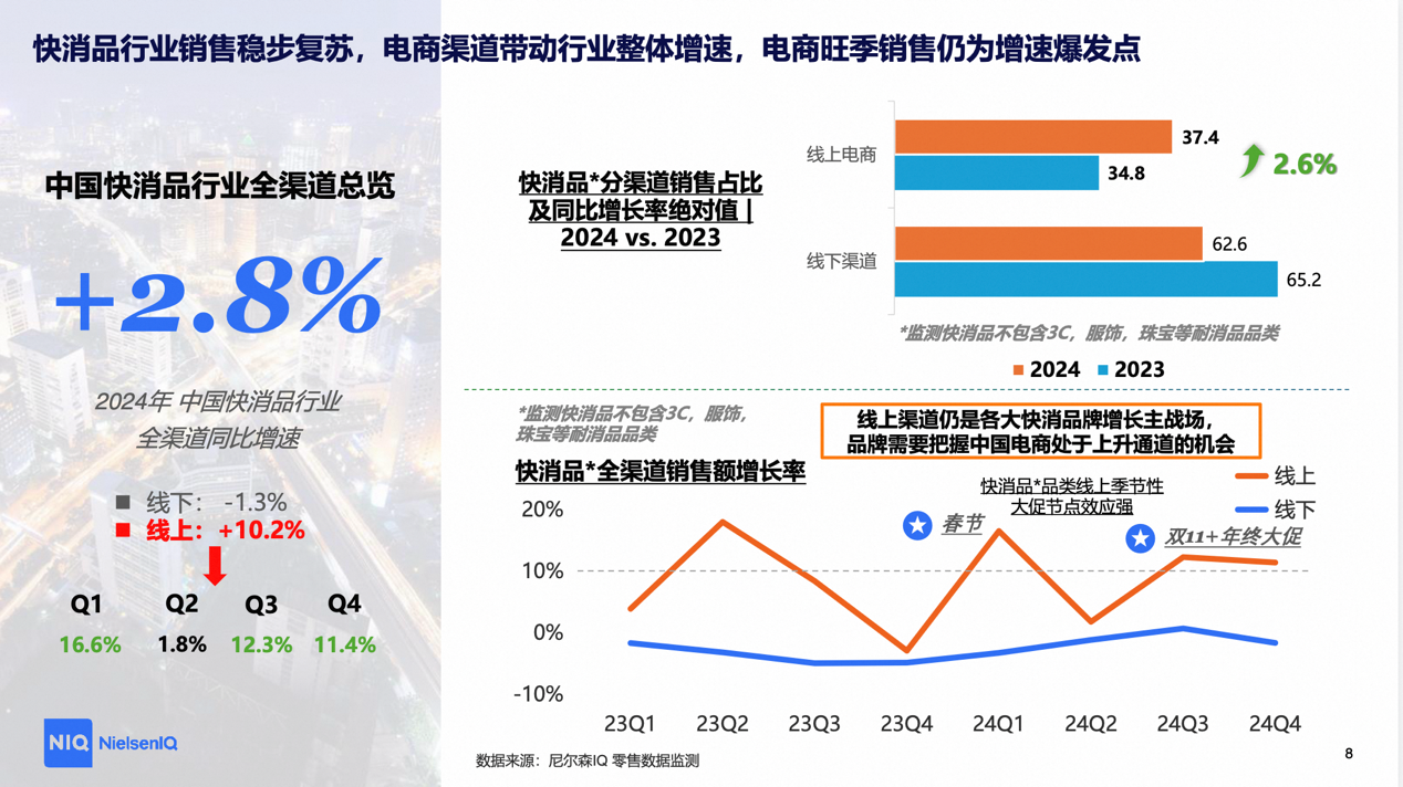 隨着消費者對品質、體驗和品牌價值的追求不斷提升,品牌化消費在中國市場呈現出穩定增長的態勢。尼爾森IQ指出,品質和創新是推動線上消費增長的核心動力,電商平台幫助品牌更好地把握市場趨勢和消費者需求,品牌商家滿足消費者對品質和情感價值的追求,從而實現品牌升級與“溢價”。