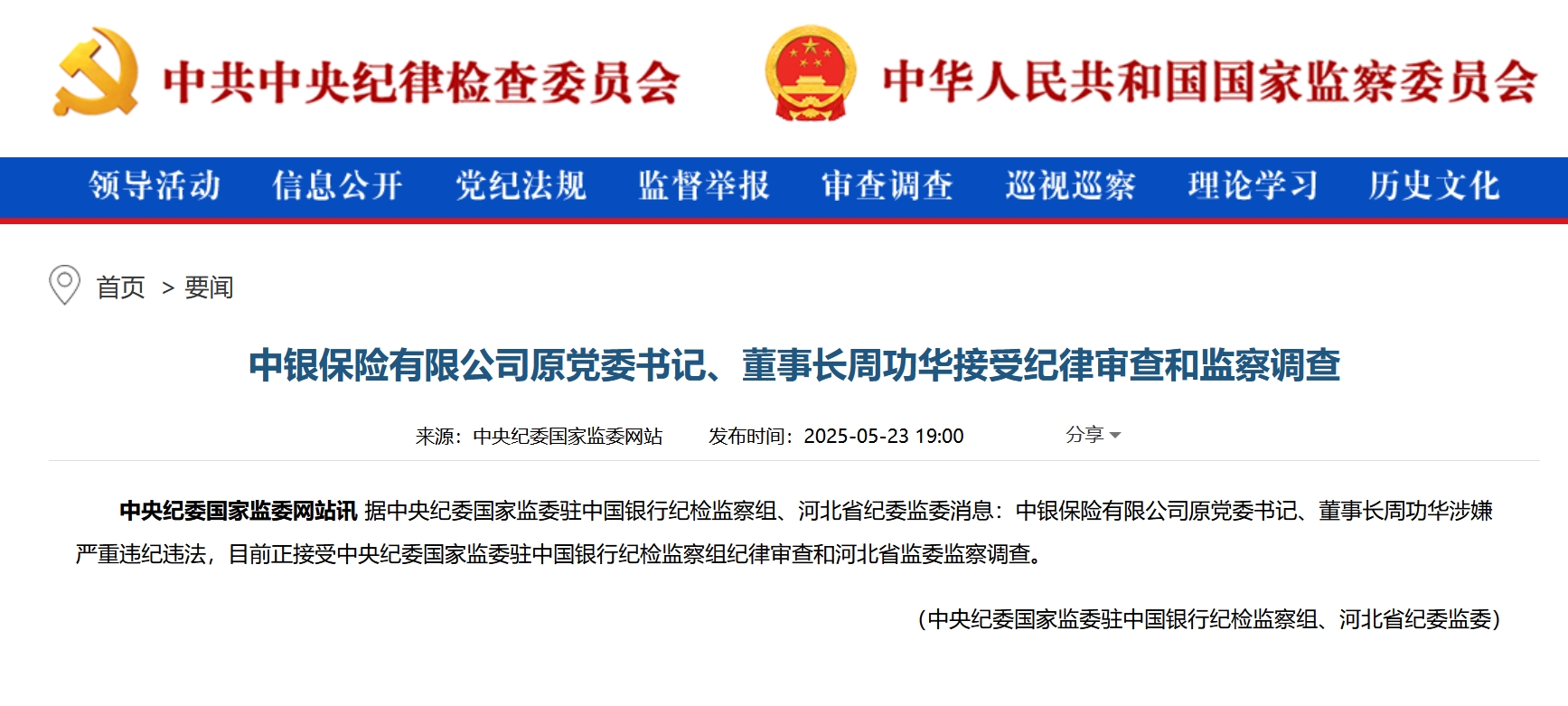 中央紀委國家監委網站5月23日發佈,據中央紀委國家監委駐中國銀行紀檢監察組、河北省紀委監委消息:中銀保險有限公司原黨委書記、董事長周功華涉嫌嚴重違紀違法,目前正接受中央紀委國家監委駐中國銀行紀檢監察組紀律審查和河北省監委監察調查。