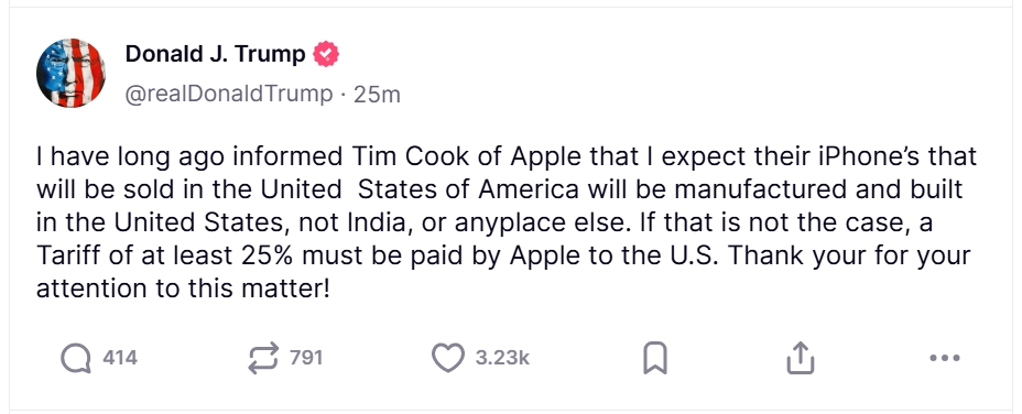 特朗普威脅對蘋果徵25%關税,蘋果盤前跳水