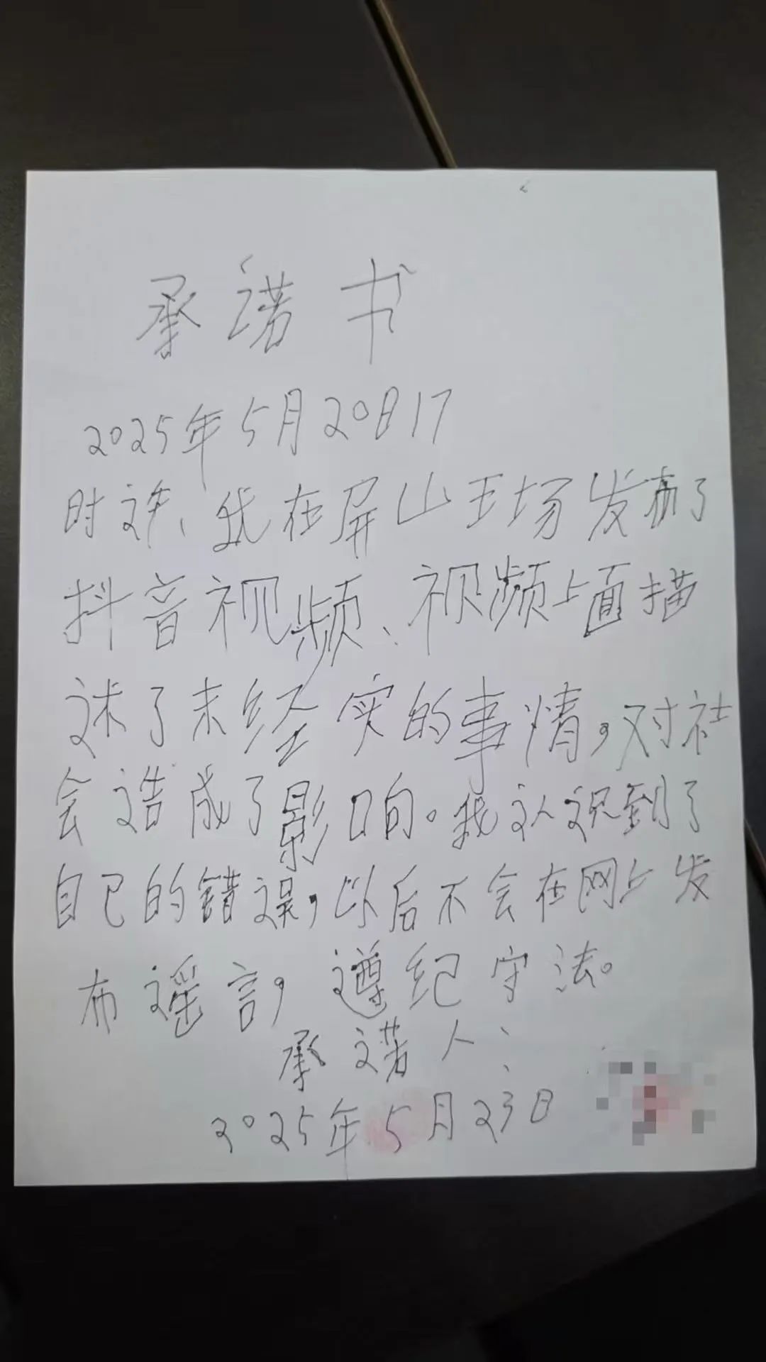 2025年5月20日,高新區網民羅某某(男,55歲)在短視頻網絡平台發佈信息稱:“四川屏山一紡織廠員工因800元工資討要幾次未果,被打了一頓後放火把整個廠燒了”,引發網民關注和議論。經核查,羅某某為趁炒熱點、吸粉引流,編造了“因800元工資討要未果並被打後縱火燒廠”的謠言信息,造成不良社會影響。羅某某對其違法行為供認不諱,高新區公安分局已依法對羅某某進行教育訓誡,本人向公安機關寫出承諾書併發布致歉聲明 。