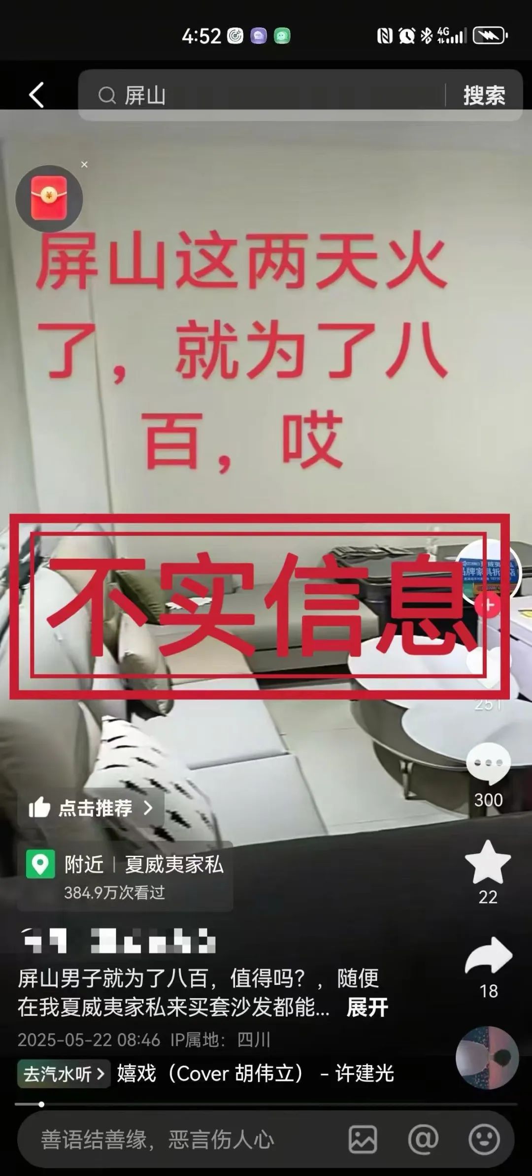 2025年5月22日,屏山縣網民康某某(男,43歲)在短視頻網絡平台發佈信息稱:“屏山1工廠員工為了八百元殺人放火”,引發網民關注和議論。經核實,康某某為引發網民關注、討論,編造“因800元工資導致殺人放火”的謠言信息,造成不良社會影響。康某某對其違法行為供認不諱,屏山縣公安局已依法對康某某處以拘留6日行政處罰。
