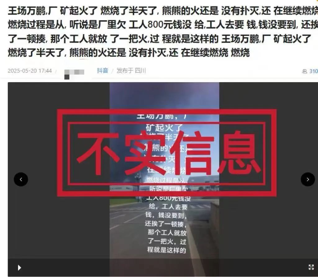 2025年5月22日,翠屏區網民何某某(女,48歲)在短視頻網絡平台發佈一張廠房起火圖片並配文稱:“四川屏山一紡織廠員工因老闆扣了800元工資,一怒之下放火把整個廠點燃。有人説他是英雄,他點燃自己照亮底層打工者”,引發網民關注和議論。經核查,何某某為吸引流量、博人眼球,編造了“因800元工資放火點燃工廠”的謠言信息,造成不良社會影響。何某某對其違法行為供認不諱,屏山縣公安局已依法對何某某處以300元罰款。