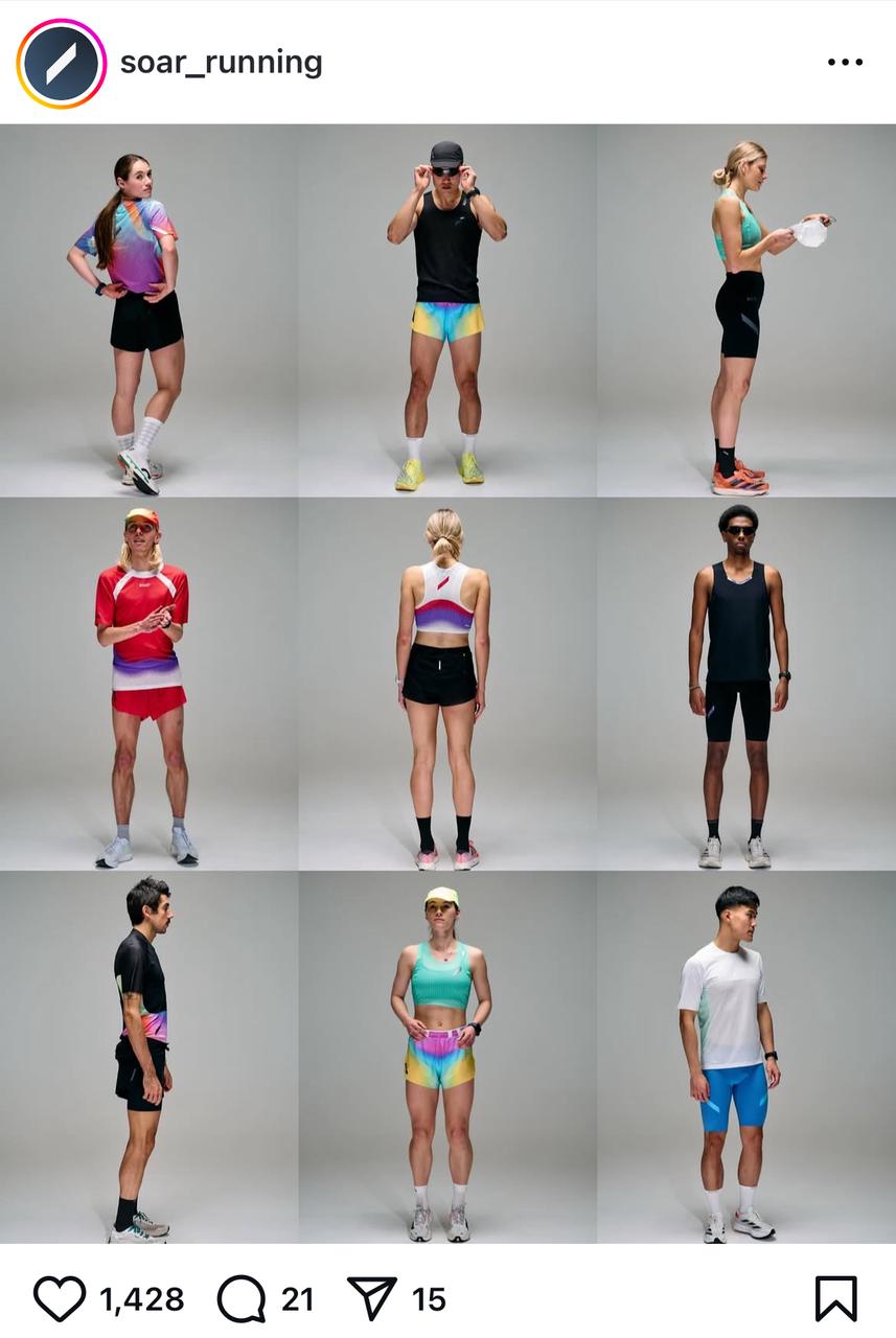 相對“年輕”的SOAR則成立在2015年,主打兼具功能性、科技感和時尚美學的設計,被稱作跑者的“高定服裝”。SOAR立足於跑步的場景,但目前品牌的產品主要集中在跑步服飾。SOAR目前僅在倫敦開出一家門店,在社交平台上的粉絲不多,但在“跑圈”小有名氣。