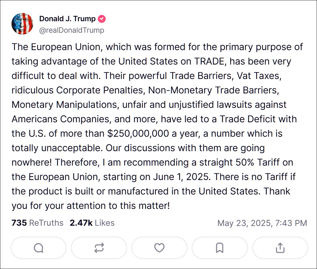 特朗普還表示,美國與歐盟的談判毫無進展,“因此,我建議從2025年6月1日起對歐盟產品直接徵收50%的關税。如果產品在美國製造或生產,則無需繳納關税。”