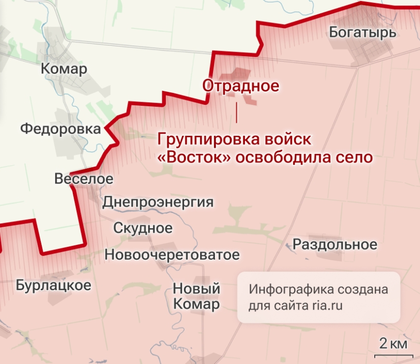 圖中紅字標出部分為奧特拉德諾耶,紅色部分在俄羅斯控制下。俄新社