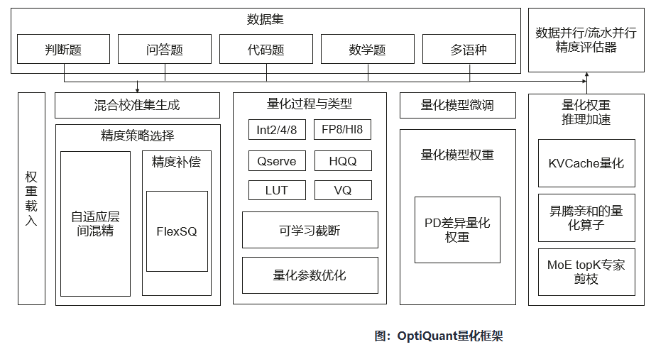針對上述問題,華為提出了OptiQuant量化框架,一種高性能保精度量化方案,設計了層間自動混精、自動混合校準、離羣值抑制、可學習的截斷和SSZW參數量化算法。除了支持業界主流量化算法功能之外,它還新增支持三個功能:接入自定義量化算法和數值類型,可以將多種量化算法的自由組合搭配使用;支持業內主流評測數據集和用户自定義的數據校準集;支持數據並行和流水並行,針對不同大小的大語言模型實現精度驗證性能加速。
