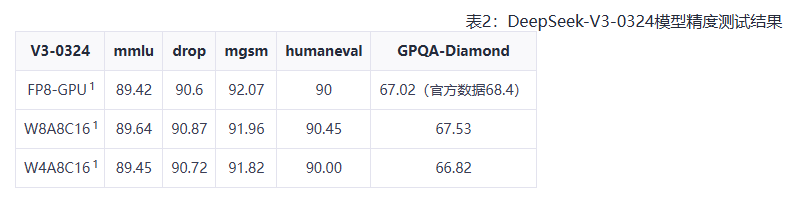 最終,基於Atlas 800I A2服務器的精度測試實驗結果顯示,對於DeepSeek-V3-0324模型,W8A8C16和W4A8C16均採用Per-channel量化,實現了推理精度與FP8-GPU持平。