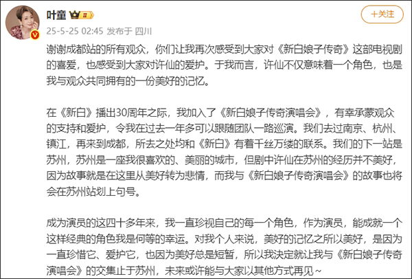 5月25日,演員@葉童 發文宣佈,“決定與《新白娘子傳奇演唱會》的交集止於蘇州。”