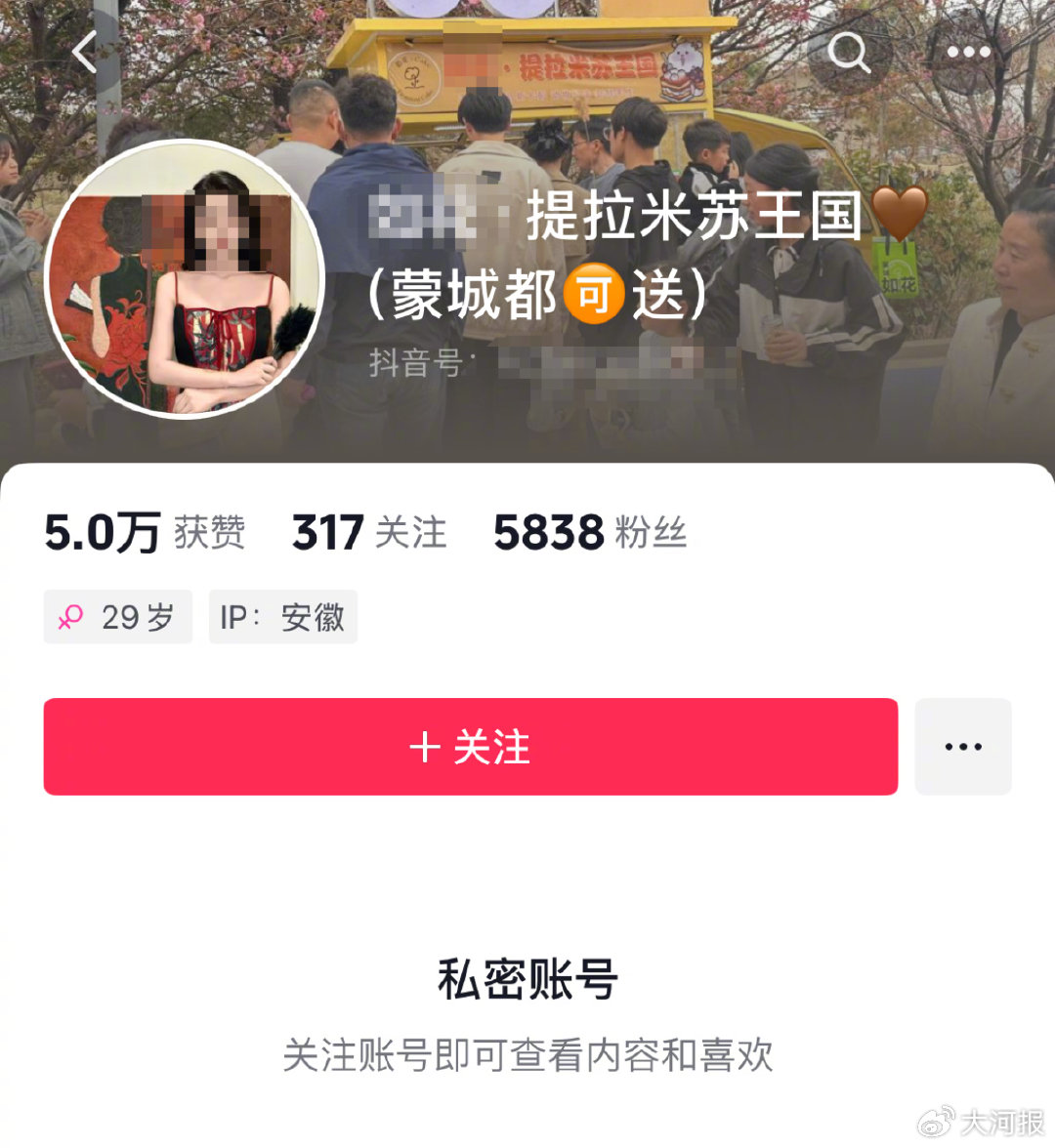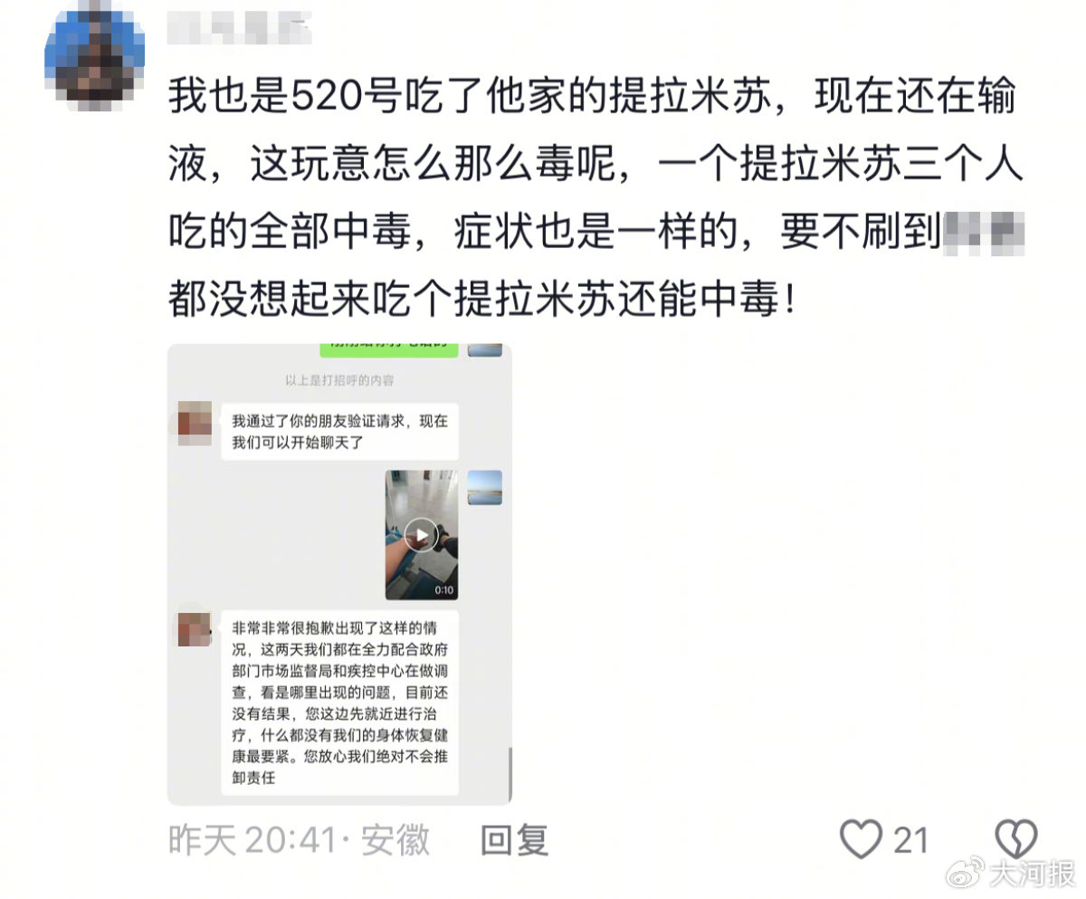 近日,安徽亳州市蒙城縣多位消費者在社交媒體上反映稱,自己購買了當地一家網紅流動攤販出售的提拉米蘇,食用後出現了身體不適。5月24日,出售“提拉米蘇”的商家、當地12315熱線針對此事回應大河報《看見》記者,目前涉事商家的社交媒體賬號已設置成私密狀態。