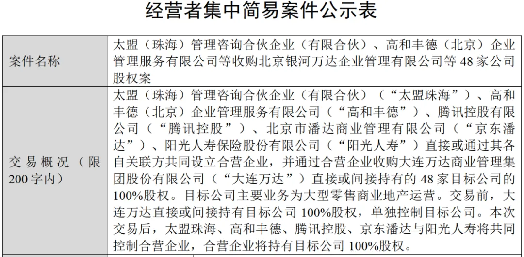 據國家市場監管總局近日披露的信息,太盟(珠海)管理諮詢合夥企業(有限合夥)(以下簡稱“太盟珠海”)、高和豐德(北京)企業管理服務有限公司(以下簡稱“高和豐德”)、騰訊控股有限公司(以下簡稱“騰訊控股”)、北京市潘達商業管理有限公司(以下簡稱“京東潘達”)、陽光人壽保險股份有限公司(以下簡稱“陽光人壽”)直接或通過其各自關聯方共同設立合營企業,並通過合營企業收購大連萬達商業管理集團股份有限公司(以下簡稱“大連萬達”)直接或間接持有的48家目標公司的100%股權。
