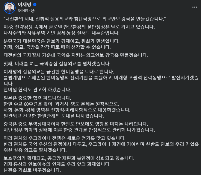 李在明在博文中稱,將會以國家利益為重,推進“實用主義外交”。李在明希望在當選後修復因非法戒嚴而受損的韓美同盟信任基礎。此外,韓美同盟也是保障韓國安全,應對朝鮮“非對稱威脅”的核心。