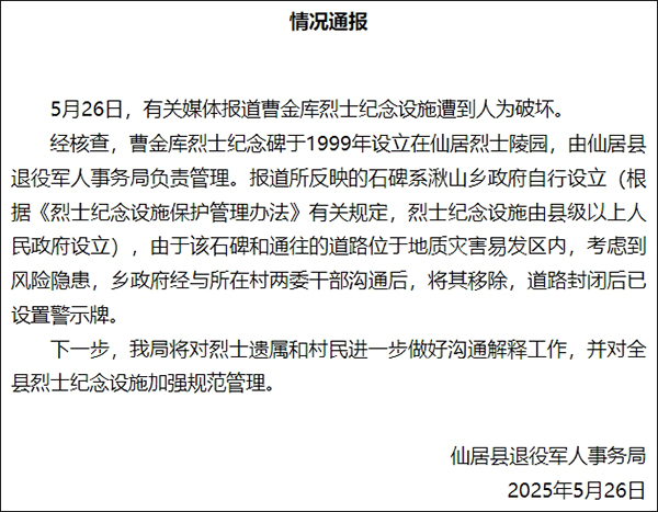 據浙江省台州市仙居縣委縣政府官方新聞客户端愛仙居消息,仙居縣退役軍人事務局5月26日發佈情況通報稱,當天,有關媒體報道曹金庫烈士紀念設施遭到人為破壞。