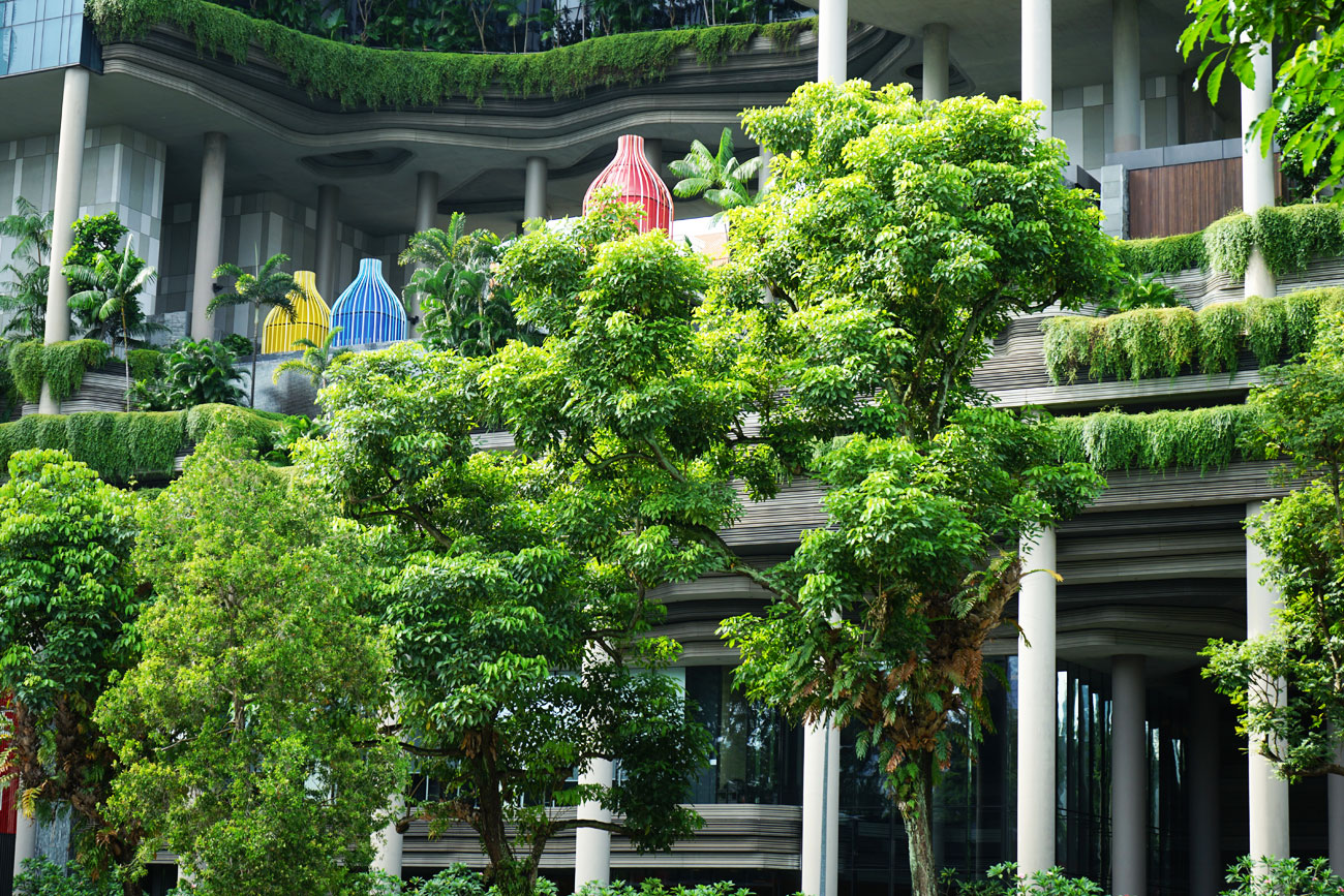 緣於熱帶海洋性氣候,新加坡街頭的林木花草終年蒼翠葱鬱,花開不斷,甚至高樓大廈的外牆凸凹處、樓宇連廊、陽台等都長滿了綠植和鮮花,將樓宇建築裝飾得如同巨大的“花瓶”——新加坡“花園城市”的讚譽在這一刻具象化了。
