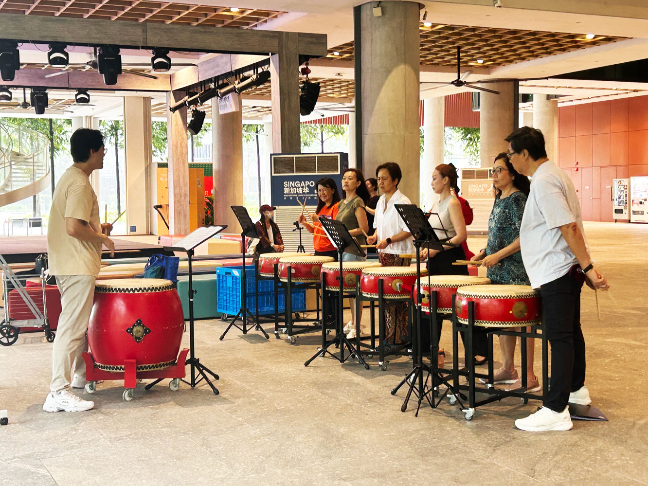 市民在新加坡華族文化中心練習中國鼓觀察者網