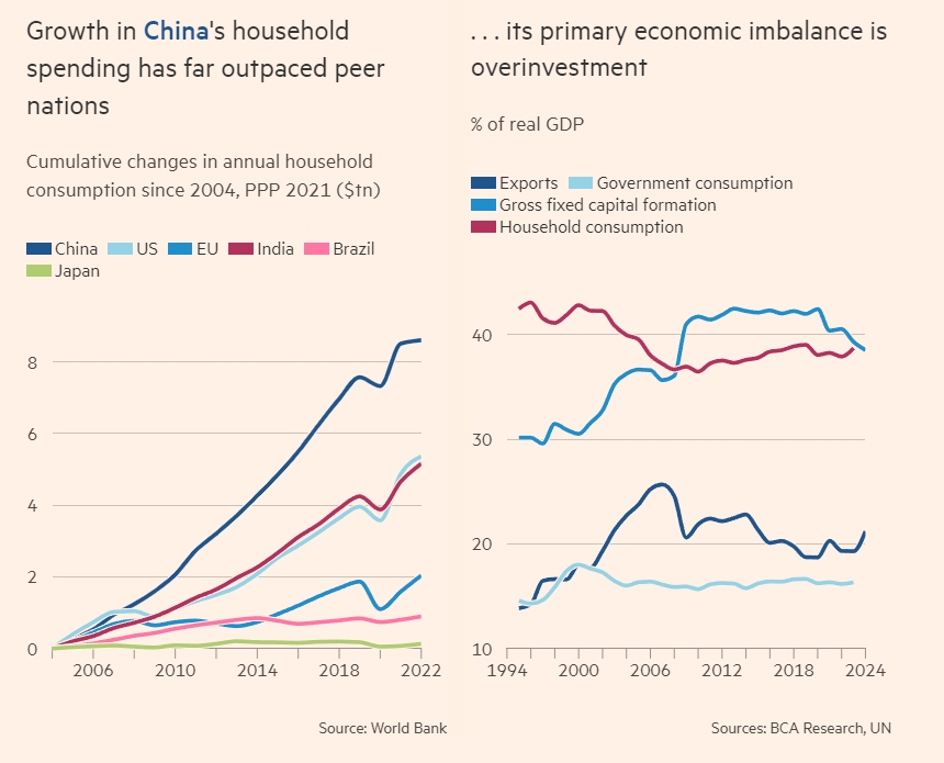 左標題:中國家庭支出的增長遠遠超過了其他同等國家。圖為各國(從左往右:中國、美國、歐盟、印度、巴西、日本)自2004年以來家庭年度消費的累積變化(萬億美元);右標題:其主要經濟失衡是過度投資。圖為四項經濟指標占真實GDP的比重變化(出口、政府消費支出、固定資本形成總額、家庭消費)《金融時報》