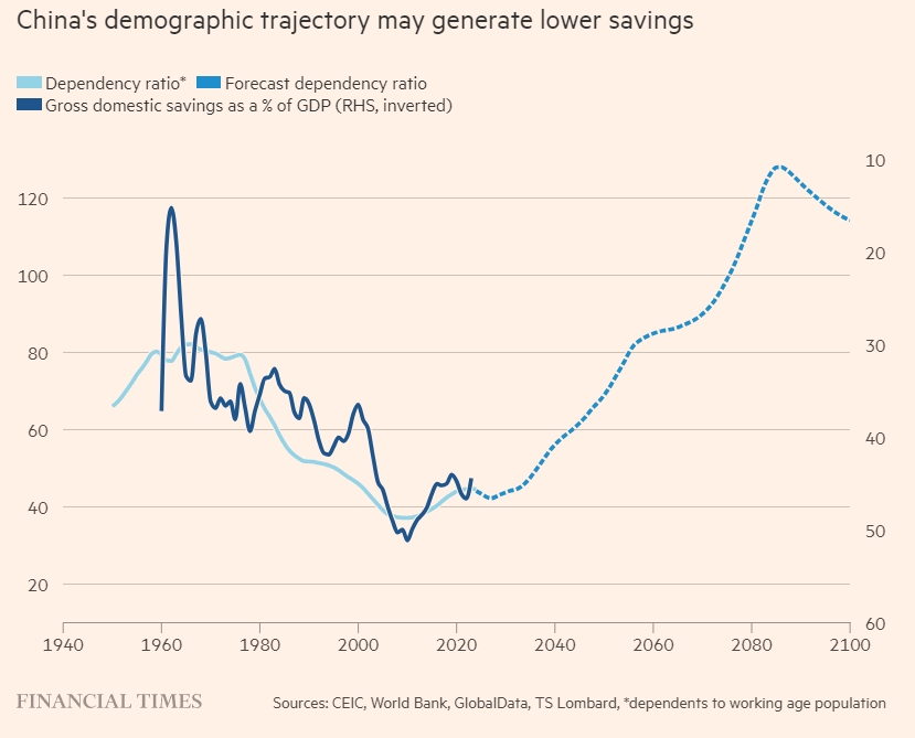 標題:中國的人口軌跡可能產生較低的儲蓄。淺藍代表人口撫養比,深藍代表國內儲蓄總額佔GDP的百分比,虛線代表預測的人口撫養比《金融時報》