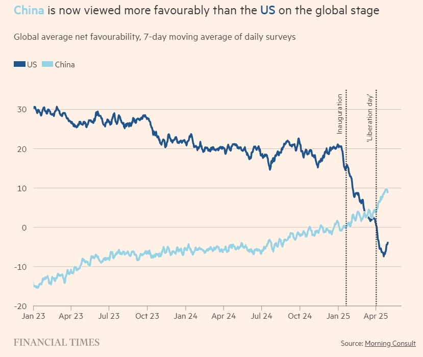 標題:在如今的全球舞台上,中國比美國更受青睞。圖為中美兩國的全球平均淨支持率變化情況,深藍代表美國,淺藍代表中國。《金融時報》