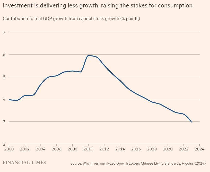 標題:投資帶來的增長放緩,加大了消費風險。圖為資本存量增長對實際GDP增長的貢獻(百分點)《金融時報》