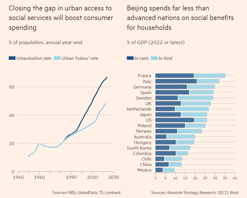 左標題:縮小城市社會服務差距將促進消費者支出。深藍代表城鎮人口率,淺藍代表城鎮户籍人口率。右標題為:中國在家庭社會福利方面的支出遠低於發達國家。圖為各國在家庭社會福利方面的支出(深藍:現金,淺藍:實物)《金融時報》