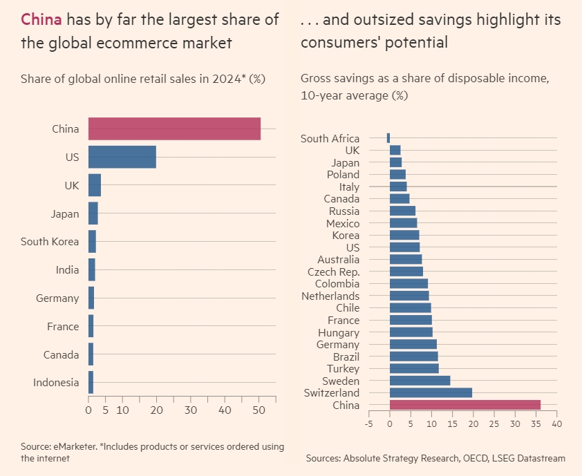 左標題:中國在全球電子商務市場中佔有最大份額。圖為2024年全球在線零售銷售額份額(%)右標題:巨大的儲蓄突顯了其消費者的潛力。圖為各國儲蓄總額佔可支配收入的比例(單位/%,取10年平均值)《金融時報》