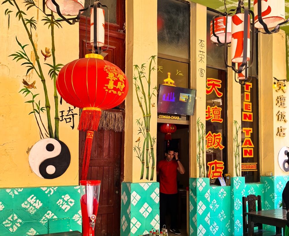 和世界各地許多熙熙攘攘的唐人街不同,古巴首都哈瓦那的“CHINA TOWN”在普通人看來只是一條很有“海外華埠風”的小巷子——狹窄的小路兩邊分佈着不同的中餐館,紅色的裝飾、梅蘭竹菊的牆畫、太極、紅燈籠……在這些餐館中,門面最大最醒目的是一家叫作天壇飯店的餐廳。當我們沿着狹窄的樓梯走上二樓,擁有拉美與中國混血相貌的老闆正手拿麥克風、身穿唐裝,為本地的古巴食客激情澎湃地獻歌一首。