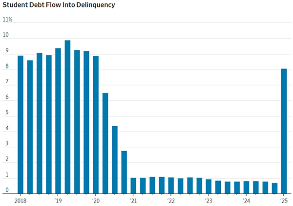 2025年一季度,美國學生貸款拖欠率激增。 《華爾街日報》製圖