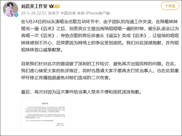 @劉若英工作室 當天也發佈聲明稱,對此深感抱歉,並向姐姐妹妹致以誠摯歉意。