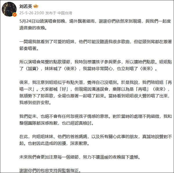 5月26日,@劉若英 發文道歉,她表示,是想和姐姐再唱一次,但由於現場溝通誤會,樂隊以為是“再唱一次”《後來》。