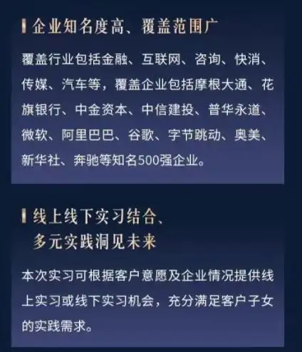 此前有網友爆料稱,興業銀行私人銀行推出一項實習計劃,“非私行客户新增資金1000萬元以上,存量私行客户新增資金500萬元以上”,可為客户子女提供知名企業實習機會,包含摩根大通、中金資本、谷歌、微軟等,要求實習期內資金不得轉移。
