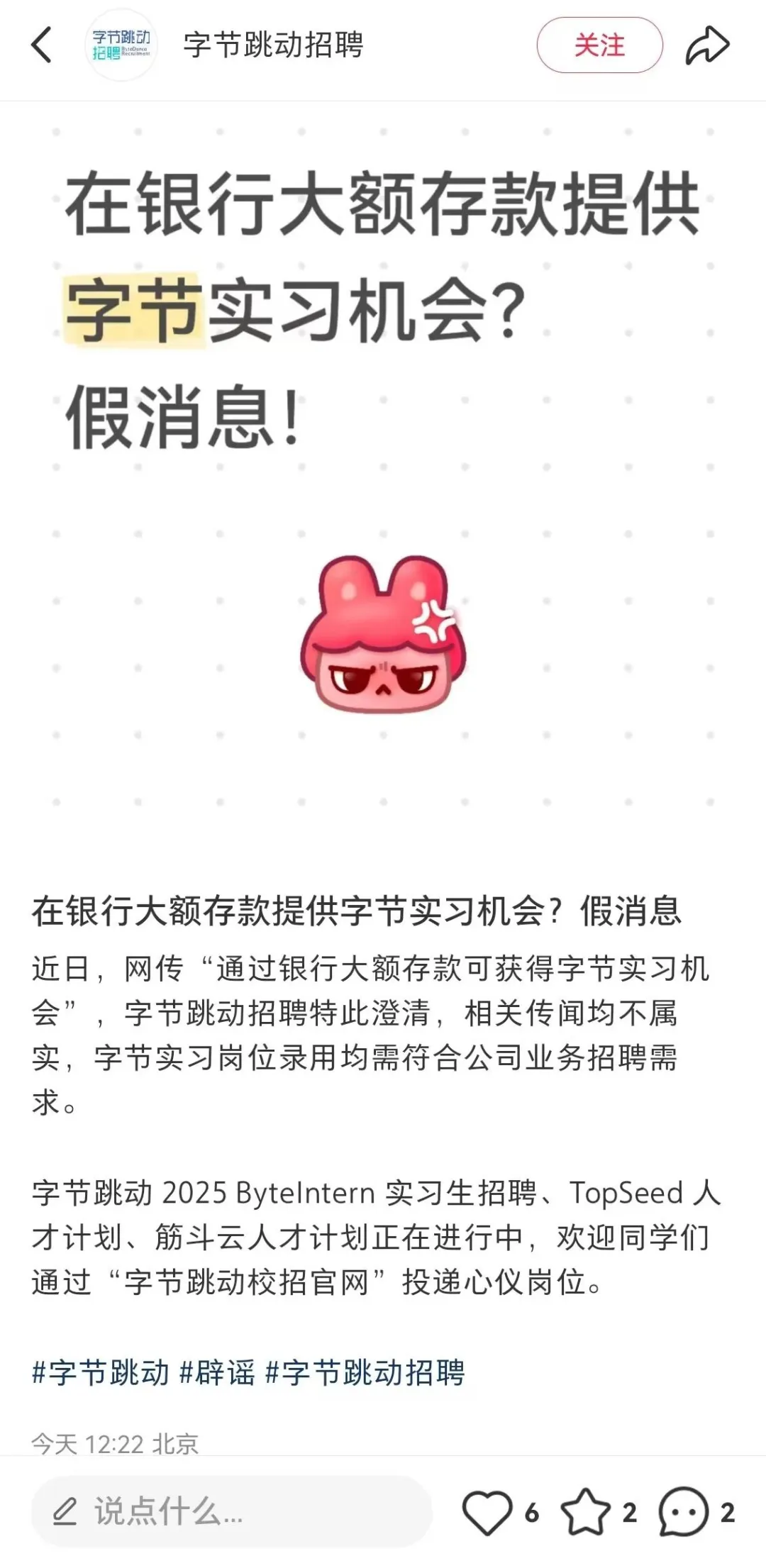 字節跳動闢謠:“在銀行大額存款提供實習機會”不屬實