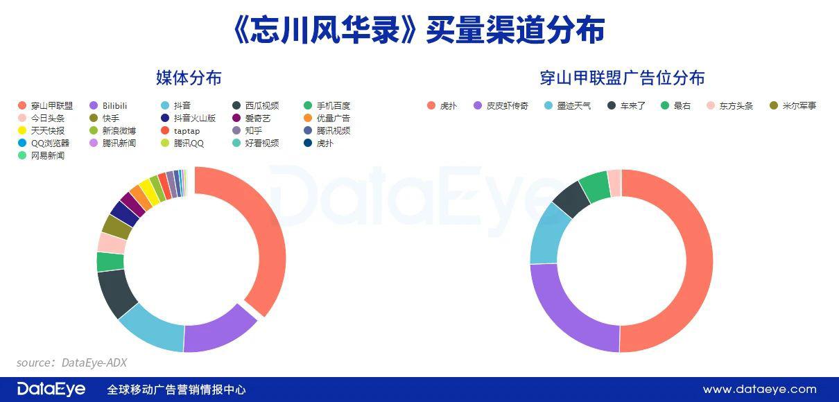 按照一位外包運維人員的説法,忘川當時的目標用户畫像是18-26歲且具備一定認知能力的女性。然而據DataEye的數據顯示,《忘川》上線之初買量渠道分佈中,最大部分約三成給了穿山甲聯盟,而穿山甲聯盟的廣告位卻有一半位於男性用户比例更大的虎撲。
