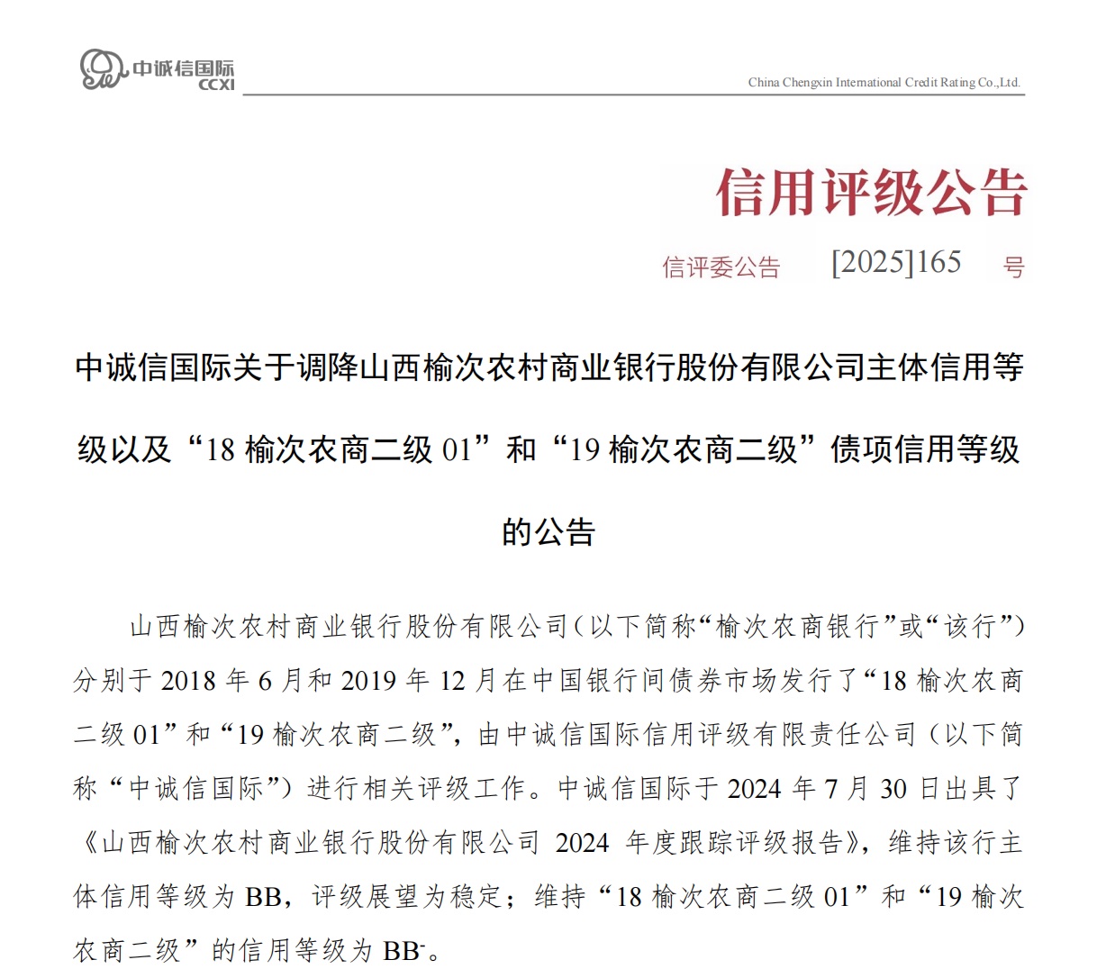 榆次農商行的困境是中小銀行風險暴露的典型案例。其資產質量惡化、資本補充無力和治理缺陷形成惡性循環,而外部支持力度不足使得改革重組步履維艱。中誠信國際警示,若宏觀經濟復甦不及預期或區域金融環境進一步承壓,該行信用風險可能加速釋放。
