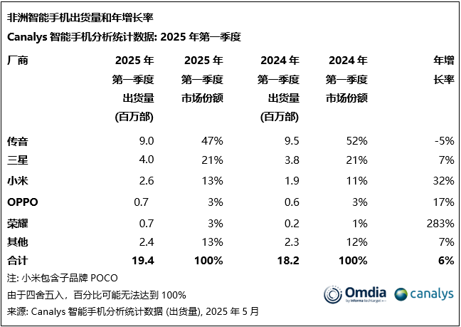 5月27日,市場調研機構Canalys發佈了2025年第一季度非洲地區智能手機市場報告。報告顯示,2025年第一季度,非洲市場智能手機出貨量同比增長6%,達到1940萬部。